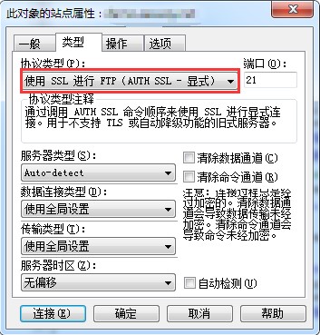 在FTP Client的站點管理中,將協議類型調整為SSL模式: