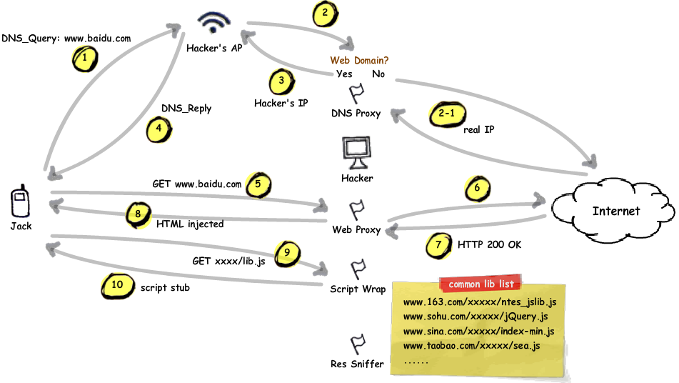基于DOM或本地的XSS攻擊。一般是提供一個免費的wifi,但是提供免費wifi的網關會往你訪問的任何頁面插入一段腳本或者是直接返回一個釣魚頁面,從而植入惡意腳本。這種直接存在于頁面,無須經過服務器返回就是基于本地的XSS攻擊。