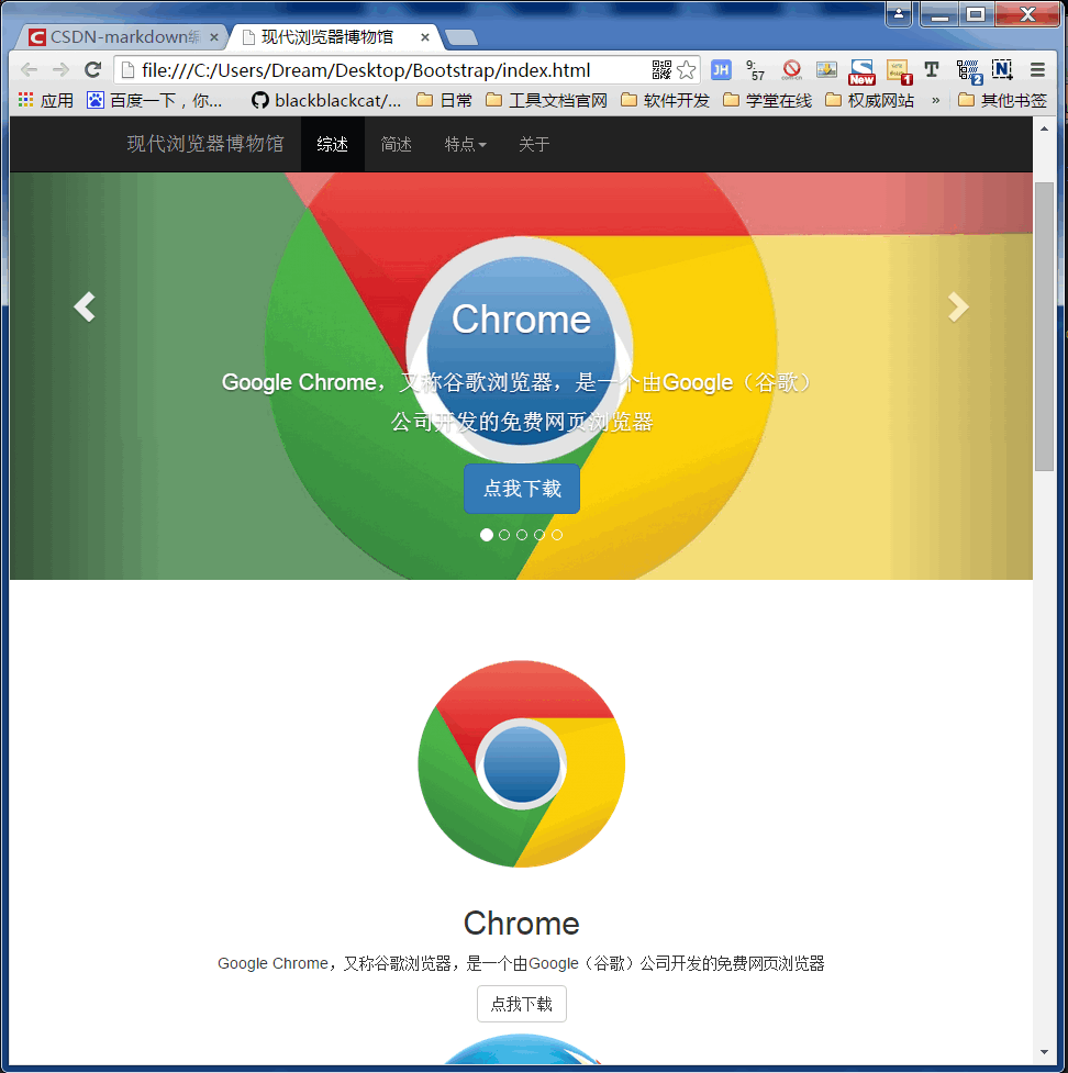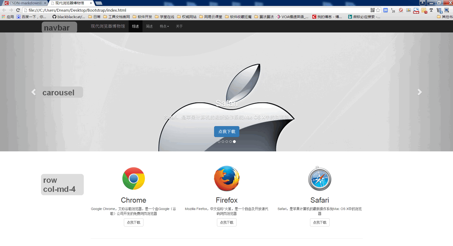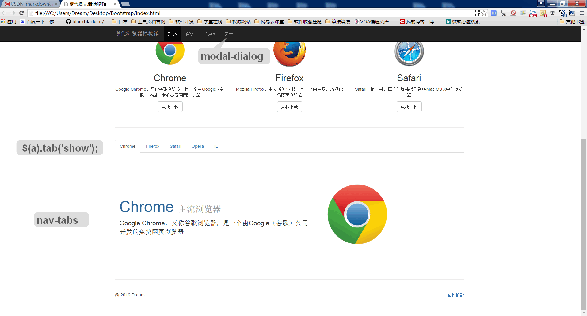 <!DOCTYPE html> <html lang="zh-CN"> <head> <meta charset="utf-8"> <meta http-equiv="X-UA-Compatible" content="IE=edge"> <meta name="viewport" content="width=device-width, initial-scale=1"> <title>現代瀏覽器博物館</title> <link href="css/bootstrap.min.css" rel="stylesheet"> <!--[if lt IE 9]> <script src="js/html5shiv.js"></script> <script src="js/respond.min.js"></script> <![endif]--> <style> body{ /*navbar-fixed-top 固定導航欄時也會覆蓋body,解決此問題*/ padding-top: 50px; padding-bottom: 50px; } .carousel{ height: 500px; background-color: #000; margin-bottom: 60px; } .carousel .item{ height: 500px; background-color: #000; } .carousel img{ width:100%; } .carousel-caption p{ margin-top: 20px; font-size:20px; line-height: 1.8; } #primary-container img.img-circle{ width:30% } #primary-container img.feature-image{ width:50%; margin-top: 60px; margin-bottom: 60px; } #primary-container .col-md-4{ text-align: center; } hr.divider{ margin-top: 40px; margin-bottom: 40px; } .feature{ margin:30px 0; } .feat-heading{ font-size:50px; color:#2b669a; margin-top: 120px; } .feat-heading .text-muted{ font-size:28px; color:#999; } </style> </head> <body> <nav class="navbar navbar-default navbar-fixed-top navbar-inverse"> <div class="container"> <!-- Brand and toggle get grouped for better mobile display --> <div class="navbar-header"> <button type="button" class="navbar-toggle collapsed" data-toggle="collapse" data-target="#demo-navbar" aria-expanded="false"> <span class="sr-only">Toggle navigation</span> <span class="icon-bar"></span> <span class="icon-bar"></span> <span class="icon-bar"></span> </button> <a class="navbar-brand" href="#">現代瀏覽器博物館</a> </div> <div class="collapse navbar-collapse" id="demo-navbar"> <ul class="nav navbar-nav"> <li class="active"><a href="#">綜述 <span class="sr-only">(current)</span></a></li> <li><a href="#">簡述</a></li> <!--下拉菜單--> <li class="dropdown"> <a href="#" class="dropdown-toggle" data-toggle="dropdown">特點<span class="caret"></span></a> <ul class="dropdown-menu" role="menu"> <li><a href="#tab-chrome">Chrome</a></li> <li><a href="#tab-firefox">Firefox</a></li> <li><a href="#tab-opera">Opera</a></li> <li><a href="#tab-ie">IE</a></li> <li><a href="#tab-safari">Safari</a></li> </ul> </li> <li><a href="#" data-toggle="modal" data-target="#about">關于</a></li> </ul> </div><!-- /.navbar-collapse --> </div><!-- /.container-fluid --> </nav> <div id="carousel-example-generic" class="carousel slide" data-ride="carousel"> <!-- Indicators --> <ol class="carousel-indicators"> <li data-target="#carousel-example-generic" data-slide-to="0" class="active"></li> <li data-target="#carousel-example-generic" data-slide-to="1"></li> <li data-target="#carousel-example-generic" data-slide-to="2"></li> <li data-target="#carousel-example-generic" data-slide-to="3"></li> <li data-target="#carousel-example-generic" data-slide-to="4"></li> </ol> <!-- Wrapper for slides --> <div class="carousel-inner" role="listbox"> <div class="item active"> <img src="OriginalMaterial/chrome/chrome-1.jpg" alt="Chrome"> <div class="carousel-caption"> <h1>Chrome</h1> <p>Google Chrome,又稱谷歌瀏覽器,是一個由Google(谷歌)公司開發的免費網頁瀏覽器</p> <p><a class="btn btn-lg btn-primary" target="_blank" role="button" >點我下載</a></p> </div> </div> <div class="item"> <img src="OriginalMaterial/IE/internet-explorer-3.png" alt="IE"> <div class="carousel-caption"> <h1>IE</h1> <p>Internet Explorer,簡稱IE,是美國微軟公司推出的一款網頁瀏覽器</p> <p><a class="btn btn-lg btn-primary" target="_blank" role="button" >點我下載</a></p> </div> </div> <div class="item"> <img src="OriginalMaterial/firefox/Firefox-9.jpg" alt="Firefox"> <div class="carousel-caption"> <h1>Firefox</h1> <p>Mozilla Firefox,中文俗稱“火狐,是一個自由及開放源代碼網頁瀏覽器</p> <p><a class="btn btn-lg btn-primary" target="_blank" role="button" >點我下載</a></p> </div> </div> <div class="item"> <img src="OriginalMaterial/opera/opera-6.jpg" alt="Opera"> <div class="carousel-caption"> <h1>Opera</h1> <p>Opera瀏覽器,是一款挪威Opera Software ASA公司制作的支持多頁面標簽式瀏覽的網絡瀏覽器</p> <p><a class="btn btn-lg btn-primary" target="_blank" role="button" >點我下載</a></p> </div> </div> <div class="item"> <img src="OriginalMaterial/safari/safari-6.png" alt="Safari"> <div class="carousel-caption"> <h1>Safari</h1> <p>Safari,是蘋果計算機的最新操作系統Mac OS X中的瀏覽器</p> <p><a class="btn btn-lg btn-primary" target="_blank" role="button" >點我下載</a></p> </div> </div> </div> <!-- Controls --> <a class="left carousel-control" href="#carousel-example-generic" role="button" data-slide="prev"> <span class="glyphicon glyphicon-chevron-left" aria-hidden="true"></span> <span class="sr-only">上一頁</span> </a> <a class="right carousel-control" href="#carousel-example-generic" role="button" data-slide="next"> <span class="glyphicon glyphicon-chevron-right" aria-hidden="true"></span> <span class="sr-only">下一頁</span> </a> </div> <div class="container" id="primary-container"> <div class="row"> <div class="col-md-4"> <img class="img-circle" src="OriginalMaterial/chrome/chrome-icon.png" alt="chrome"/> <h2>Chrome</h2> <p>Google Chrome,又稱谷歌瀏覽器,是一個由Google(谷歌)公司開發的免費網頁瀏覽器</p> <p><a class="btn btn-default" href="#" role="button">點我下載</a></p> </div> <div class="col-md-4"> <img class="img-circle" src="OriginalMaterial/firefox/firefox-icon.png" alt="Firefox"/> <h2>Firefox</h2> <p>Mozilla Firefox,中文俗稱“火狐,是一個自由及開放源代碼網頁瀏覽器</p> <p><a class="btn btn-default" href="#" role="button">點我下載</a></p> </div> <div class="col-md-4"> <img class="img-circle" src="OriginalMaterial/safari/safari-icon.jpg" alt="safari"/> <h2>Safari</h2> <p>Safari,是蘋果計算機的最新操作系統Mac OS X中的瀏