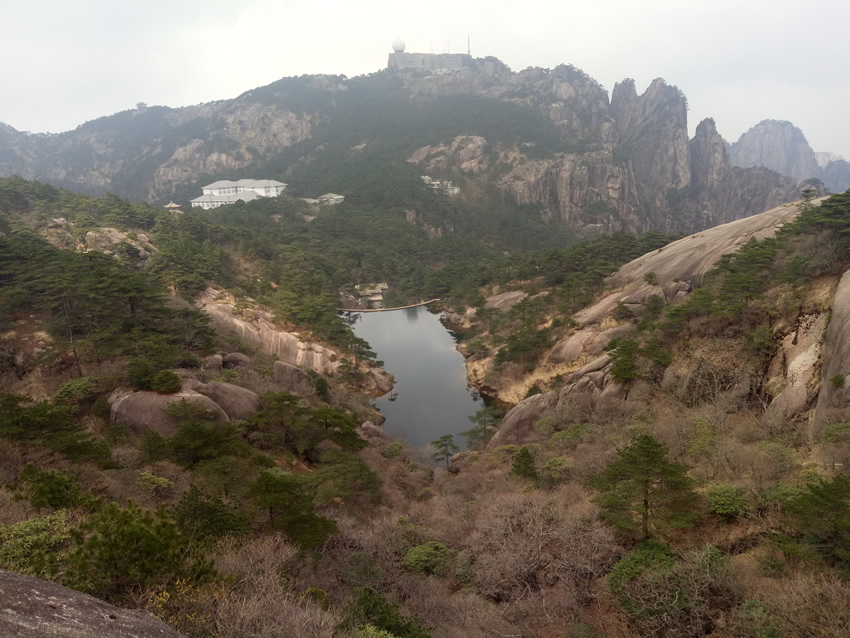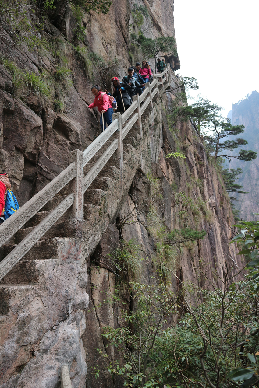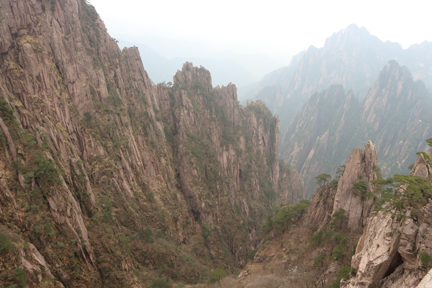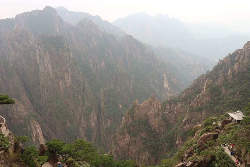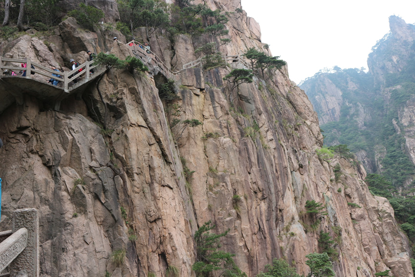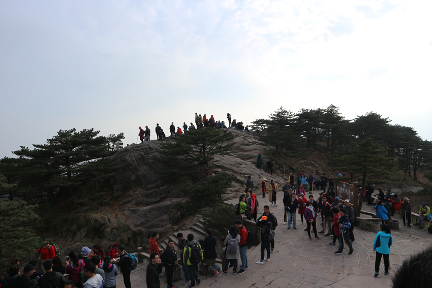 接著,我們來到了天下第一奇山——黃山。黃山原名黟山,因峰巖青黑,遙望蒼黛而得名。后因傳說軒轅黃帝曾在此煉丹,故改名為黃山,一直沿用至今,發展成如今中國最著名的旅游景區之一,素有“五岳歸來不看山,黃山歸來不看岳”的美名。我們在黃山風景區換乘中心坐環保車至慈光閣,25分鐘的車程卻經歷了好多個和武當山一樣的180度的大轉彎,身子隨著車來回晃蕩,緊張又刺激。車上有幾位游客搞怪似的唱起了《山路十八彎》,十分應景,大家啼笑皆非,卻也輕松了許多。接著我們坐纜車到達玉屏樓景區,此時已是人山人海,好不熱鬧。導游帶領大家觀賞了迎客松、送客松、陪客松、文殊臺、玉屏臥佛等景點,眺望天都峰。黃山風景區面積160.6平方千米,東起黃獅,西至小嶺腳,北始二龍橋,南達湯口鎮,分為溫泉、云谷、玉屏、北海、松谷、釣橋、浮溪、洋湖、福固九個管理區,爬山路線很多,前山上后山下,或后山上前山下,所以上山時還有很多游客在同一條路下山。山路比較窄,人擠人,一開始并不太好走。到了蓮花新道,不再那么擁擠,一路上途觀到黃山最高峰--蓮花峰,經過又陡又窄的一線天來到了鰲魚洞,觀賞鰲魚峰、鰲魚馱金龜。在天海區白云賓館旁稍作歇息后,馬不停蹄爬上第二個高峰--光明頂:飛來石、東海、南海、西海、北海和天海,五海煙云及怪石盡收眼底。
