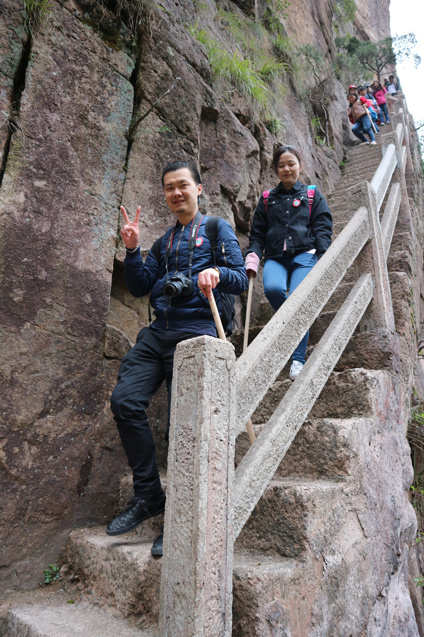 登山是一項很累的運動,但也收獲頗豐,不僅鍛煉大家的身體和毅力,沿途還能欣賞到許多美景,感受大自然的風光。體力好的同事勁頭十足,體力不好的也不由地加快腳步緊跟其后,大家說說笑笑,也是一種樂趣。山里有許多峭壁深壑,看起來十分驚險,很多小花小草生長在石頭夾縫中,頑強又美麗。沿途中還遇到了很多挑夫,他們專為游客或山上的商鋪酒店挑運物資。挑著擔子的肩膀沉重無比,腳步卻不敢懈怠分毫,即便稍作停留,也努力負重前行。不由地感嘆生活不易,以勞動為生的人值得人尊敬,這一切都激勵著我們前進。
