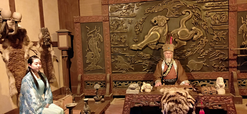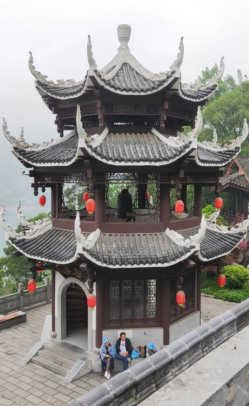 之后我們返回當陽頭碼頭登船前往燈影閣碼頭,乘坐扶梯去往巴王寨。巴王寨是用石頭、原木和泥土作為原材料建筑而成,記錄并呈現了一個民族從興盛到衰弱的歷史過程,沿路看到磨石、雕刻等具有農耕風情的巴人生活,古色古香。然而老天下起了雨,大家狼狽前行,錯過了燈影石的好風光。不過有兩位穿著巴人服飾的大叔在雨中駐守于巴王宮外,繼續扮演他們的“角色”,相當敬業。巴王宮內刀槍劍戟擺在中堂兩側,一股肅殺之氣沖天而起,巴王端坐在殿中,旁邊是巴王女兒。雖然這是人造的仿古景點,但似乎有那么點意思。聽另一位導游說,如果不下雨的話,每天都會有古巴人風情的仿古舞蹈表演,很好看,不禁感到遺憾。不過我們還聽了蘭曲,看了十分鐘的女書小劇場,各有特色。