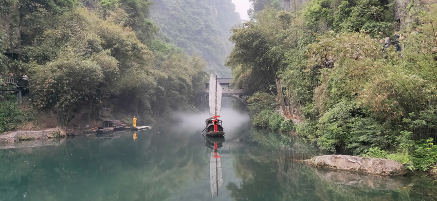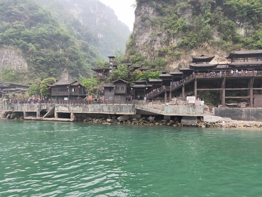 下船第一站-當陽頭碼頭,這里是游客中心,有很多餐館,我們跟隨導游吃過飯后便前往第一個景點-水上人家。穿過售貨長廊,便看到了龍進溪:正對溪口的江北山崖上,一條帶狀石嶺從山頂蜿蜒而下,快臨江時向上高高翹起如一條巨龍,龍頭所向,像要跳進南岸的清溪內,龍進溪因此而得名。岸邊幾只古帆船迎風而立,纖夫們在叫喊著,頗為熱鬧。這里溪水清綠,林木蒼翠,不遠處還有土家族打扮的紅衣姑娘撐著紅傘站在船頭,后面還有人工制造的仙氣圍繞,真的是“龍溪橋下春波綠,驚鴻拂面照影來”。