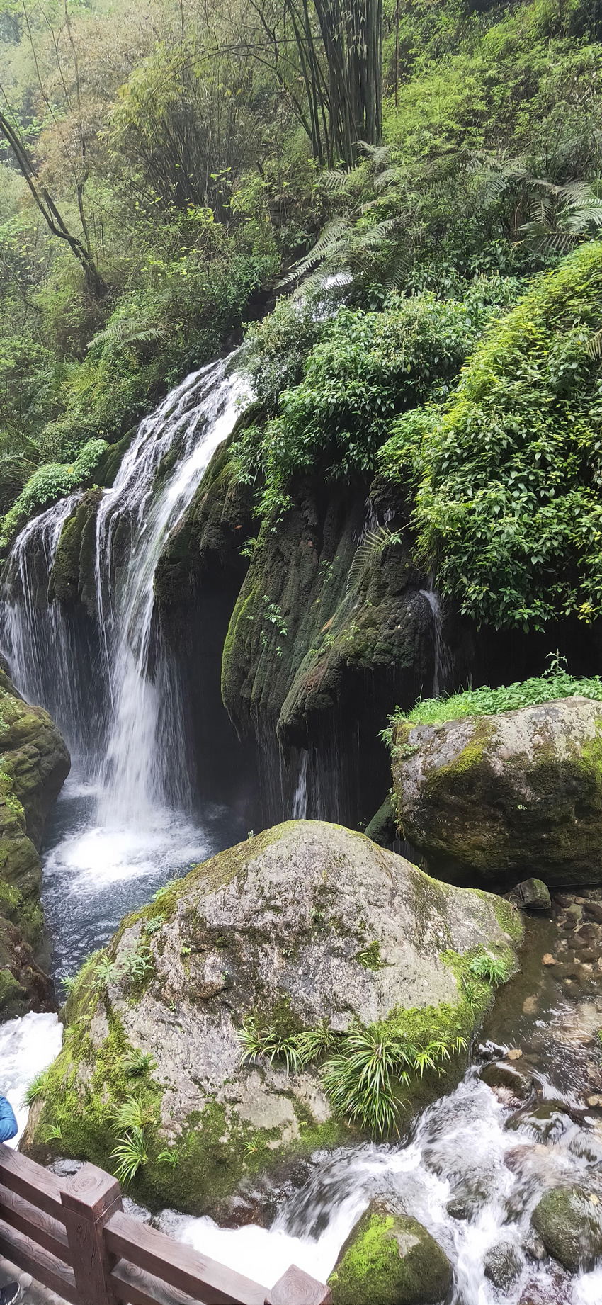 這里一半著陸,一半入水,青山綠水之間,景色如畫。一路上能看到溪里的小魚、小鵝,溪邊洗衣服的大嬸和蕩舟的幺妹子,還有衣著古風的美女在閣樓里彈琴,盡顯當地溪上人家的日常生活。接著我們來到了“鵲橋”,婚嫁表演的閣樓,可惜當時站在閣樓最左側,未能完全觀賞。印象最深刻的是男扮女裝的媒婆,拿著一個大煙桿左右搖擺地走下來,整個表演比土家打扮的姑娘們細致、入戲得多,哈哈。最后是黃龍瀑,水流從對面山崖一個山洞流出,呈扇形展開,傾瀉而下,匯入崖下的深潭,水聲如雷貫耳,響徹山谷,讓人神清氣爽,忍不住留念合影。
