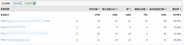 在這里,我們主要觀察提供IP數最多的這些頁面,跳出率如何。如果發現大量頁面的跳出率達到60%以上的時候,就需要考慮對網站進行微調了。因為這些頁面提供做了最多的流量,很大程度上直接影響著網站的整體數據。一般來說,跳出率在20%-40%之間是比較正常的。