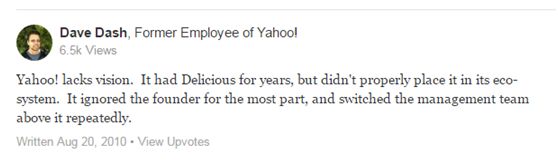 雅虎的一些高管表示,梅耶爾并未好好運用在谷歌學到的數據驅動方法來做決斷。她在聘用一些管理人員時沒有嚴格審核,而這些決定讓公司付出了高昂代價。雅虎前員工也對雅虎做出評價:雅虎缺少遠見。他很大程度上忽視創始人,并且過于頻繁的更換領導層。
