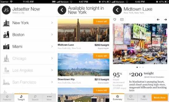 值得一提的是, Jetsetter APP的預訂流程相當流暢,從選擇到預訂只需3個步驟。精巧的圖像捕捉功能已迅速成為了標配,它極大地簡化了輸入支付信息的繁瑣流程。同時Jetsetter的APP界面精美簡約、優(yōu)雅不凡,可以說達到了藝術品的水平,只需一眼,就讓你難以舍棄。
