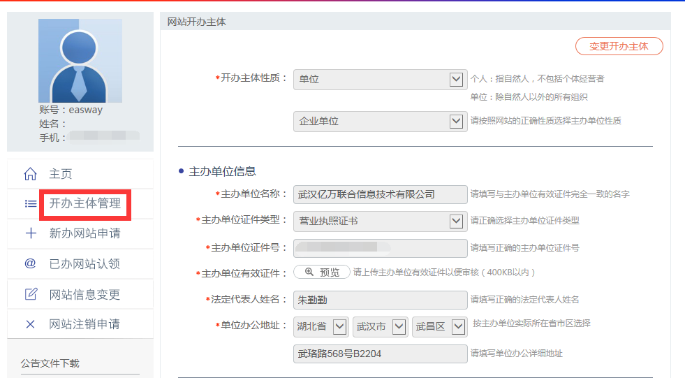 二、注冊成功后登陸,需要錄入以下主體信息,并上傳您公司的最新營業執照、網站負責人身份證正反面及手持證件照片,以下截圖信息僅供參考。