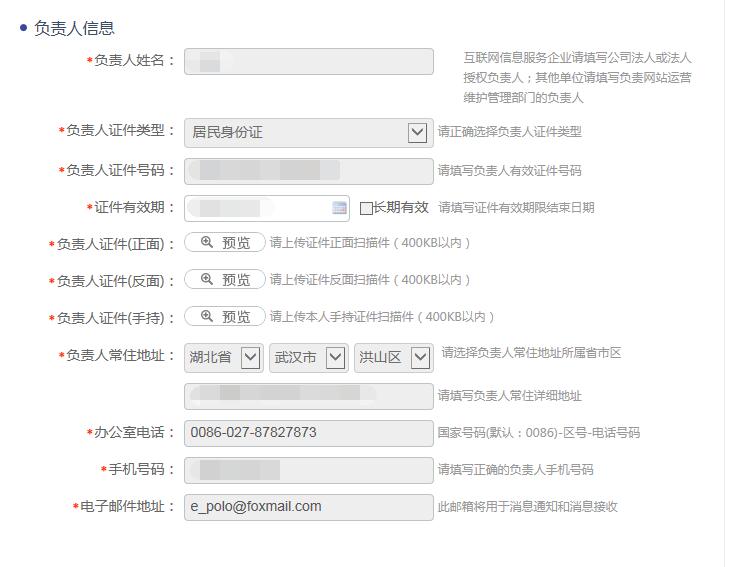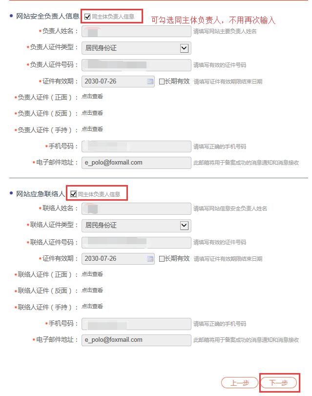 網站安全負責人信息和應急聯絡人,與主體負責人一致時,可勾選此項,不用再次錄入