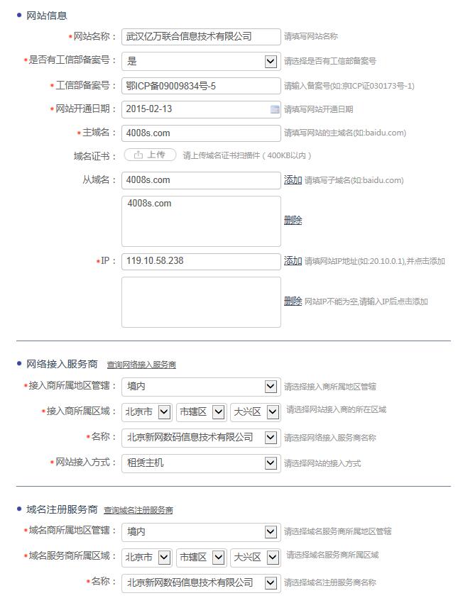 錄入您公司官方網站的基本信息,如備案號,網站開通時間,域名及ip,網絡接入服務商及域名服務商,以下截圖信息僅供參考。