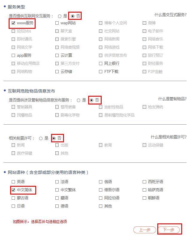 服務類型等信息如圖所示,選擇否并勾選相應選項。