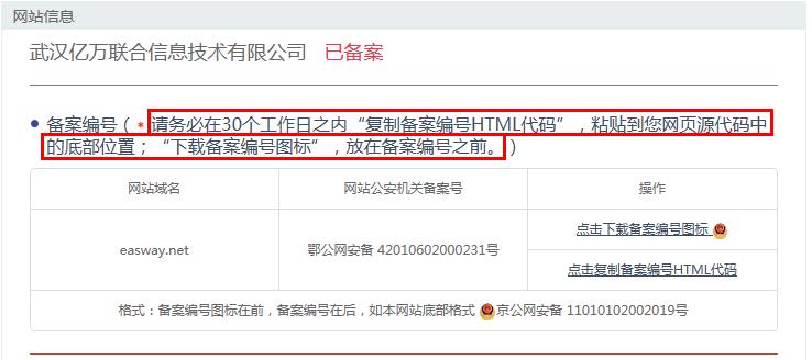 五、在詳情里獲取備案代碼,請務必在30個工作日之內“復制備案編號HTML代碼”,粘貼到您網頁源代碼中的底部位置;“下載備案編號圖標”,放在備案編號之前。備案完成!